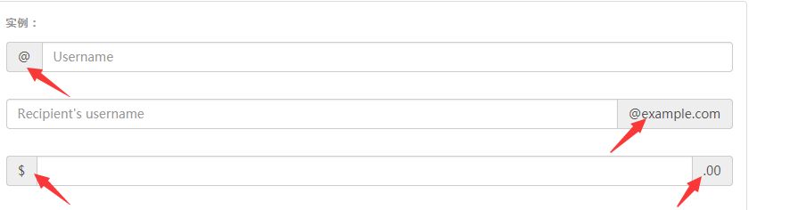 每一行都必须放在 .input-group中,然后加上.input-group-addon (添加文字,复选框,单选框)或 .input-group-btn (添加按钮,下拉菜单)类,可以给前面或后面添加额外的元素。