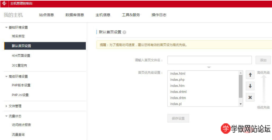 如果不想用上述方法,以万网虚拟主机为例(下图):将默认首页index.htm移到最上面,最高优先级,保存设置,在网站后台更新主页就没有index.html了。