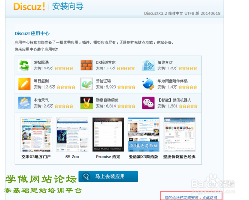 - 点击下一步。稍等片刻会出现安装成功 点击 您的论坛已完成安装,点此访问 即可访问自己的论坛