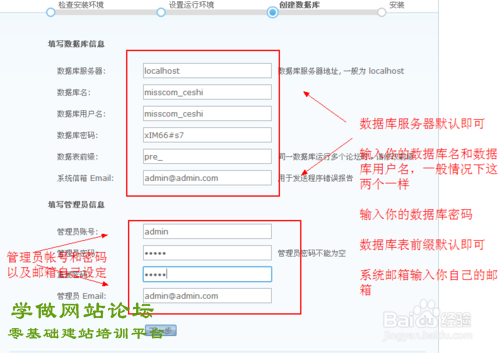 - 输入你的 数据库名、数据库用户名、数据库密码和系统信箱管理员账号、管理员密码、管理员 Email 自己设定