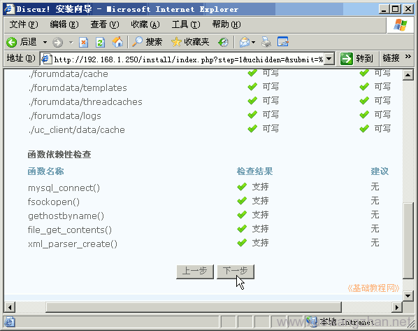 4)接下来是环境检查,应该都是绿色的勾,如果出现红色的差,表示你的网站空间不支持该功能,只能更换网站空间了。(相关知识:如何购买域名和空间)点"下一步"继续;