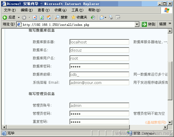5)接下来安装论坛数据库,数据库用户名和密码在你的空间管理后台都可以查能,直接复制粘贴就可以了。(注意:复制数据库用户名密码时一定不能有空格),再给管理员账号也设定一个密码,点"下一步"继续;