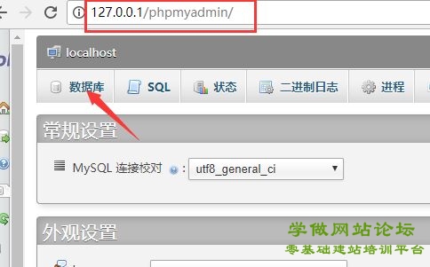 - 再用浏览器打开 127.0.0.1/phpmyadmin/ ,创建本地数据库。选择“数据库”,写上数据库名,再点“确定”即可。