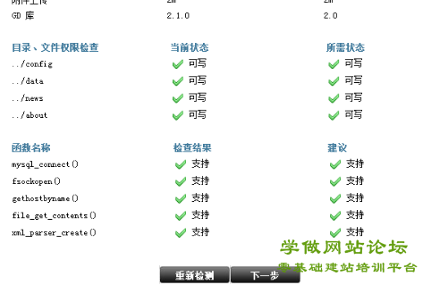 - 程序检测“服务器环境”。目录权限出现:(x号)表示服务器环境不支持,需要服务器管理员自行开通。如下图: