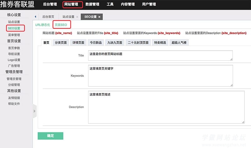 5. 网站标题和SEO设置 (很多用户不知道首页的网站标题如何修改,包括其它的一些栏目标题设置看下图。)