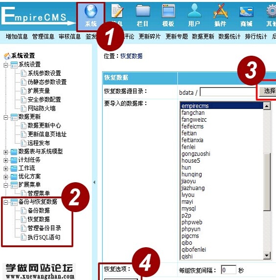 - 3.登录后台之后(http://您的域名/e/admin),点击系统——备份与恢复数据——恢复数据——选择目录——选中42944_20140217022624——最后点击开始恢复,等待恢复好数据库就行了!恢复后的管理员账号和密码分别是admin和admin888