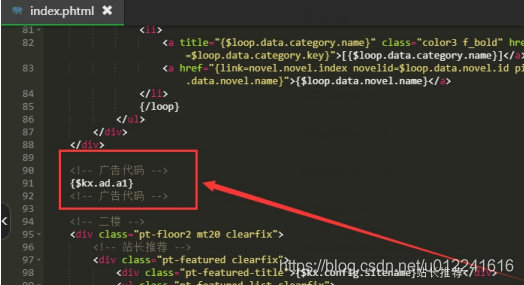 ,2,调用模板语法,把你上一步添加的广告位模板语法,复制,黏贴到你前端要 放广告的页面对应的 html 模板文件相应位置上。如下图。
