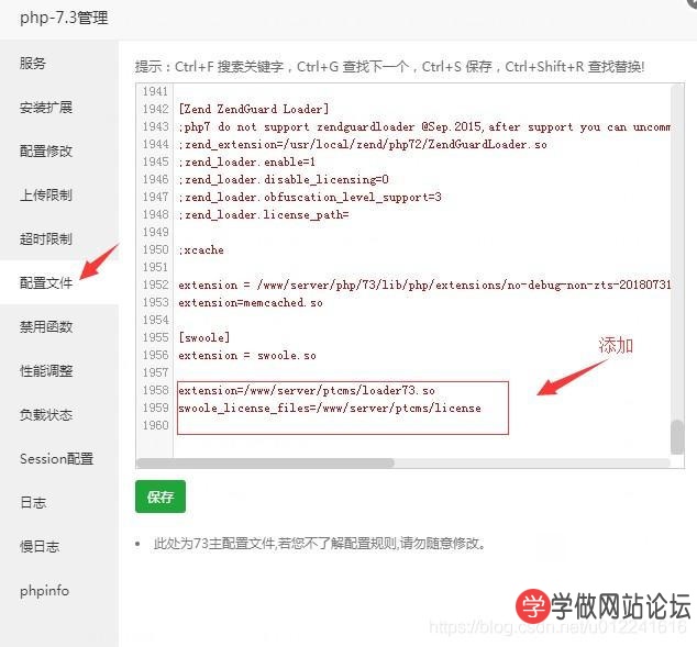 5、进入php7.3设置,在配置文件里面添加代码,代码安装好后,重启PHP或者重载配置