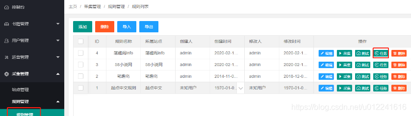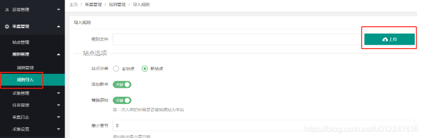 采集规则 使用方法:采集管理——规则管理——规则导入——上传文件(新站,新规则) 导入采集规则请注意:导入的时候一定要选择“新站点”、添加新书要选择“开启”按钮,其他设置不要 乱动,否则会出错