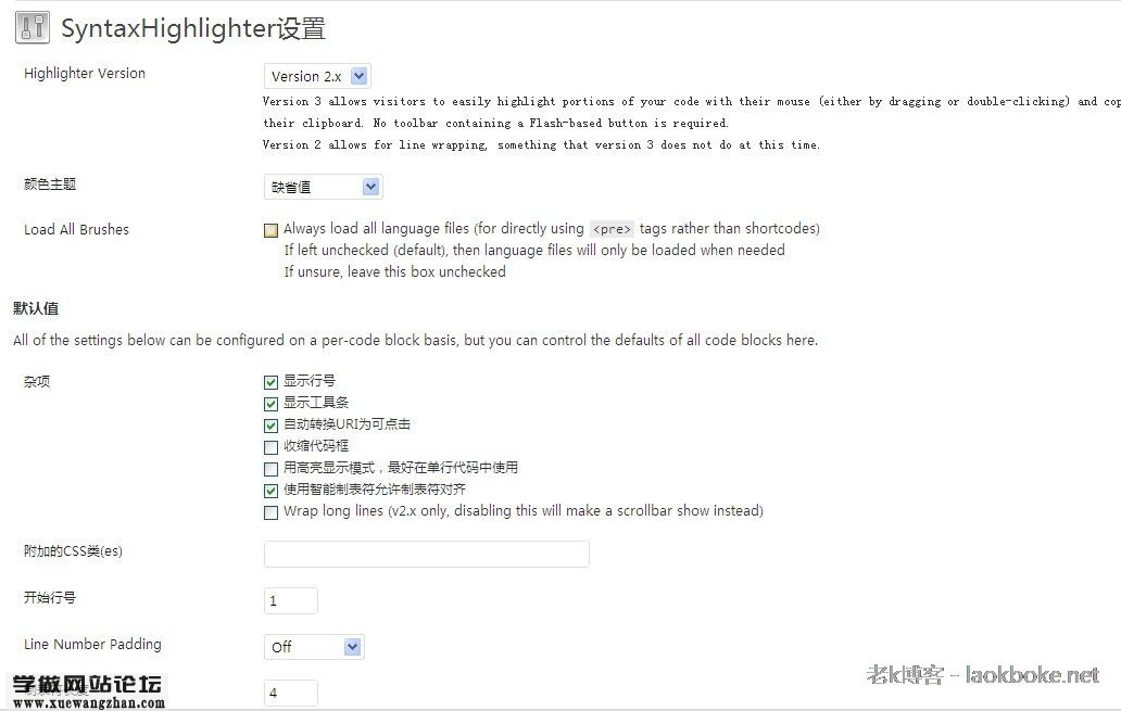 - 安装完插件后,可以对插件的相关选项进行设置,该插件可以实现SyntaxHighlighter的2.x和3.x版本之间进行切换,建议选择2.x版本。