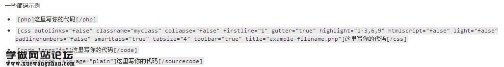 - 在需要插入代码的文章里用与代码相符的标签把代码包起来,例如需要插入css代码,则只需要用[/css]及其闭包把代码包围起来就行,在插件设置页面后面有一些简单的示例可以参考,如下图: