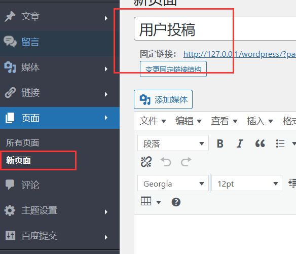 第二步:进入网站后台 --页面 ---新建页面。标题写:用户投稿;页面模板选择【用户投稿模板】;