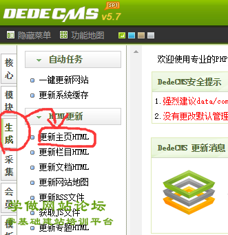 - 登录Dedecms织梦网站后台,点击后台菜单 【生成】-【更新主页HTML】。如图: