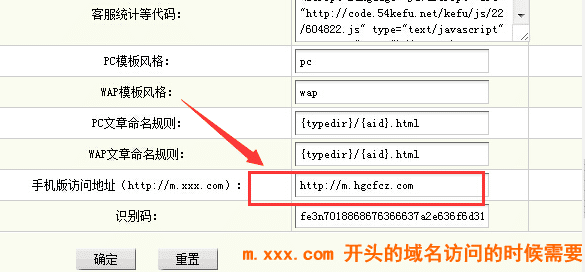 {dede:field name='position' function='str_replace("/m/","/",str_replace("http://www.域名.com","",@me)) /} - 修改后台手机访问地址,如下图: