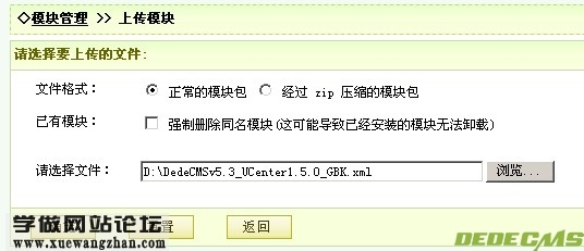 进入DedeCMS后台,模块——模块管理——上传新模块。选择“正常的模块包”,在请选择文件的地方选择整合包文件(DedeCMSv5.3_UCenter1.5.0_GBK.xml文件)下载地址:http://updatenew.dedecms.com/DedeCmsV5.3Module/gb2312/DedeCMSv5.3_UCenter1.5.0_GBK.xml,(右击另存为)点确定。