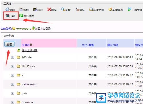 - 以上的步骤就把网站数据备份好了。下面就是对网站源码进行备份。登录网站空间后台,找到网站安装目录,点击【全选】,选择全部的后台源码文件,在点击【压缩】生成的格式,一般apache服务器生成.zip后缀的格式,其他服务器类型选择.rar格式就好,如下图: