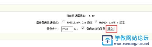 - 织梦默认已经全选了要备份的数据表,建议不要做修改,然后鼠标往下拉,织梦已经默认选择好了数据库版本,都是选择最新的,不用修改,然后会看见一个【提交】按钮,点击【提交】,如下图:
