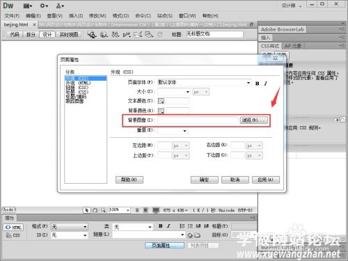- 在弹出的“页面属性”对话框中,单击“背景图像”后面的“浏览”按钮。