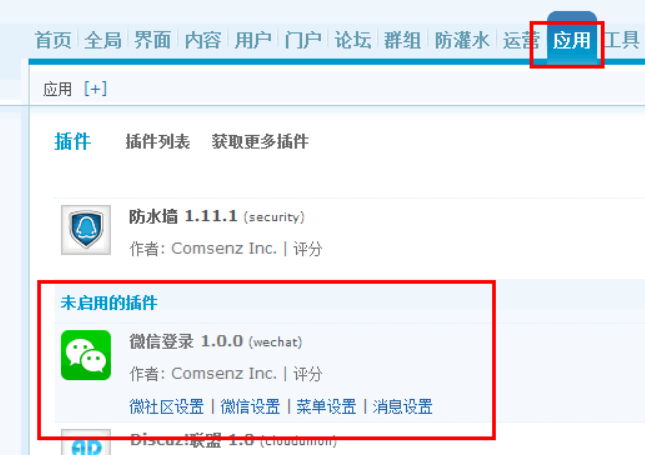 首先在Discuz!的应用里面,我们能够看到微信登录这个插件,点击后面的启用。(微信登录是默认不启用的,需要站长手动启用)