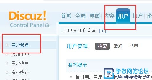登录DZ后台,点击【用户】-【用户管理】-搜索某个用户;