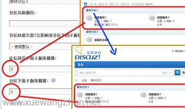 对于版块下的子版块排列,同上,点击该版块后面的【编辑】,然后进如该版块(创建版块1)下的【扩展设置】,将“论坛版块下级子版块横排”设置为2,得到的效果如直线连接指向的效果。