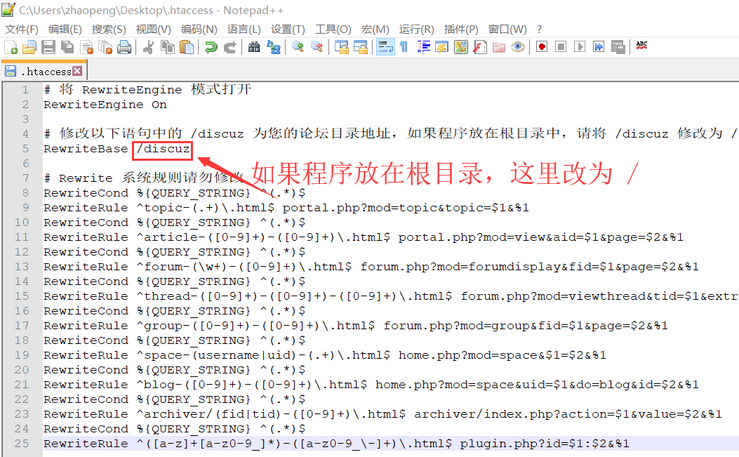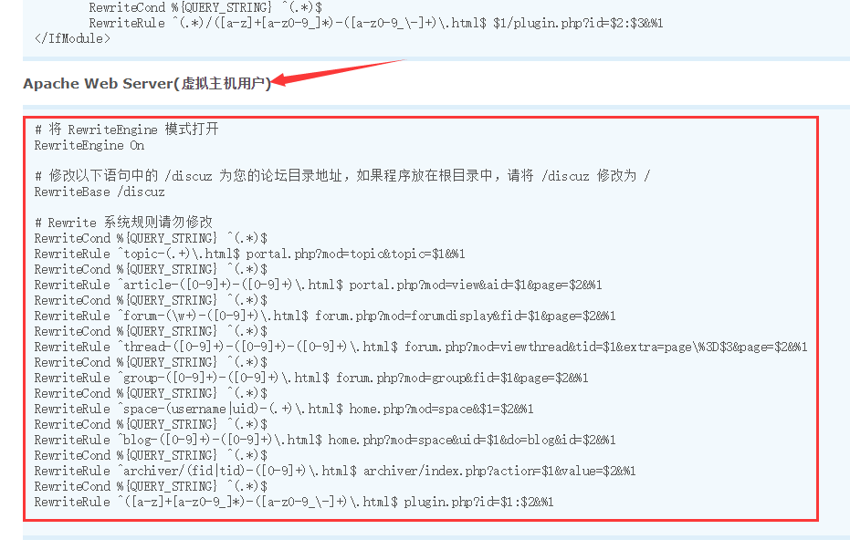 - 使用DW或者notepad 新建一个页面,将上图红框中的所有代码粘贴进去,然后保存为.htaccess。(注意:如果论坛程序放在根目录中,请将 图中的/discuz 修改为 /)