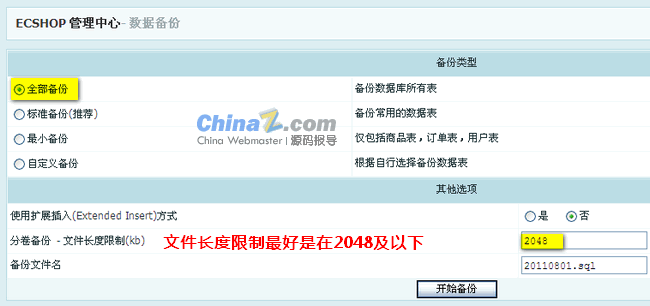 进入ECShop的网站后台,依次选择 数据库管理—>数据库备份,选择全部备份,分卷这里特别好是2048及以下,如果分卷文件太大了会在新站那导入失败的,如下图: