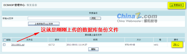 2.安装好之后,登录新网站的后台,选择数据库管理—>据库备份—>恢复备份,在这里你会看到刚才传上去的数据库备份文件,点操作下的导入开始恢复数据,如下图:
