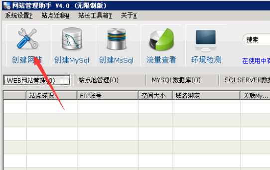 - 第三步:创建站点。点击【网站管理助手】软件界面的“创建站点”,如下图: