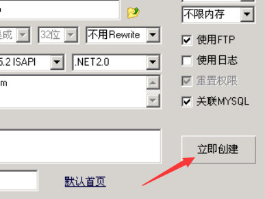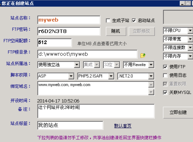 右侧列表(连接数、最大CPU、带宽、内存等)一般保持默认,如果是ASP或者ASP.NET程序,可以取消“创建MYSQL”的勾,不创建mysql。如果需要创建mysql,创建完成后mysql用户名和mysql数据库名都是FTP账号,mysql密码默认是FTP密码。 - 网站信息填写好之后,点击“确认创建”就新建完一个站点了。