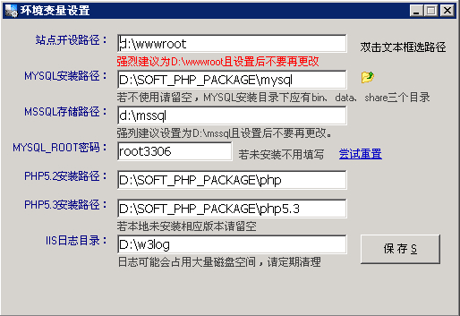 注意:首次运行网站管理助手,会弹出“系统配置”窗口,一般情况下只需要检查站点开设目录是否存在,如果不存在,请先手工建立目录。强烈建议保持我司的默认配置环境,不要修改mysql、php的安装路径,建议D:\wwwroot目录作为网站目录,出现问题时方便核查原因。如图: