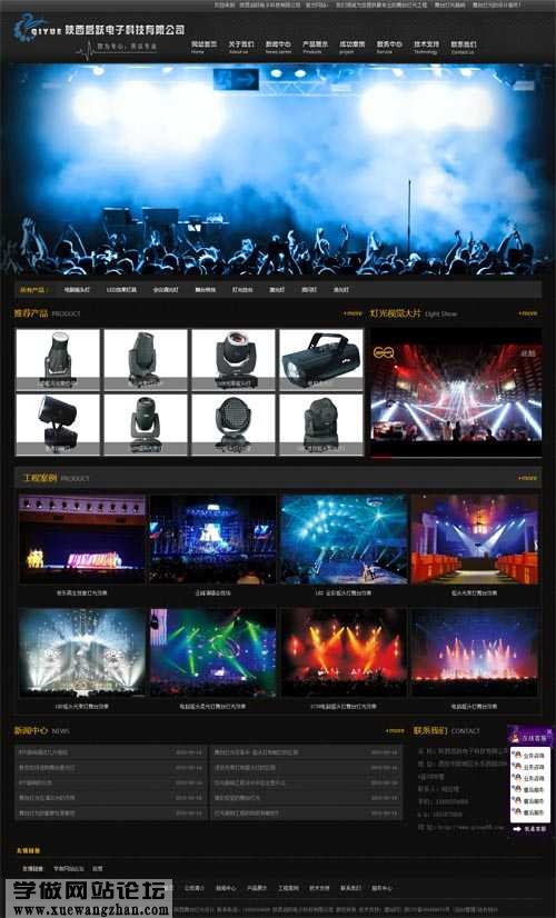 西安启跃是一家细致从事舞台音响灯光,灯光音响工程业务的公司,由于公司的业务发展的需要,学做网站论坛为其公司建立了自己的官方网站,舞台音响灯光公司网站在制作时,在网站的主页使用了大胆的黑色底色,使用超炫的全屏布局结构。