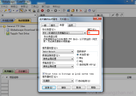 2. 在站点属性页面,单击 类型 ,端口填写为 21 。