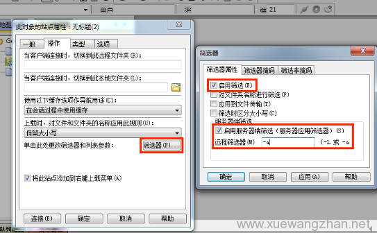 3. 显示隐藏文件方法:在站点属性页面,单击 操作 选项,单击 筛选器 。勾选 启动筛选 启用服务器端筛选 ,远程筛选器中填写 -a 。