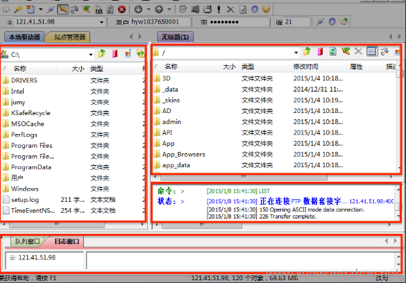 - 右边:远程区域即远端服务器,双击目录图标可进入相关目录;命令区域。