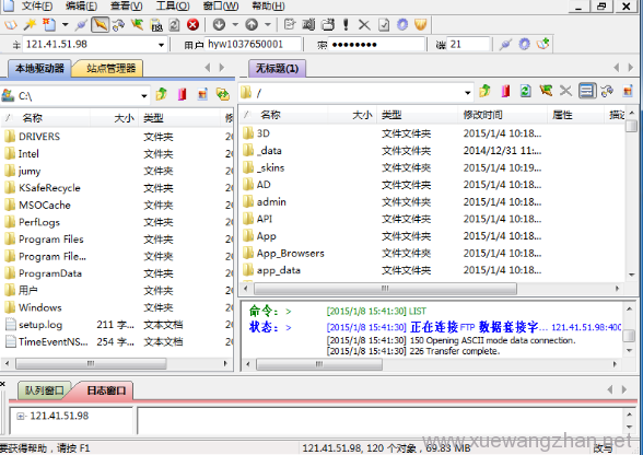 - 从本地区域选定要上传的网页或文件,双击或用鼠标拖至远程区即可完成上传工作。