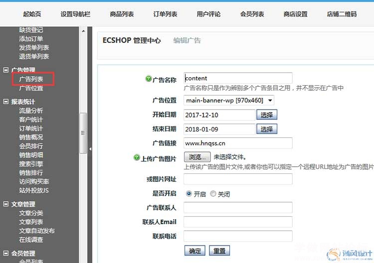 点击广告管理--广告列表,新建一张广告图,填写上传相关信息,保存。