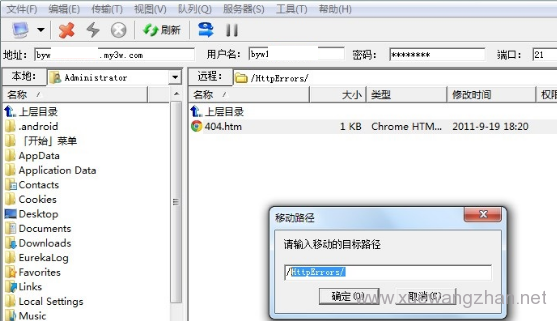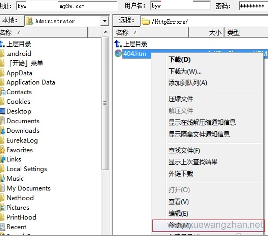 1. 登录 FTP 后选中要移动的文件(例如移动 /HttpErrors 下的 404.htm 到上级目录)。