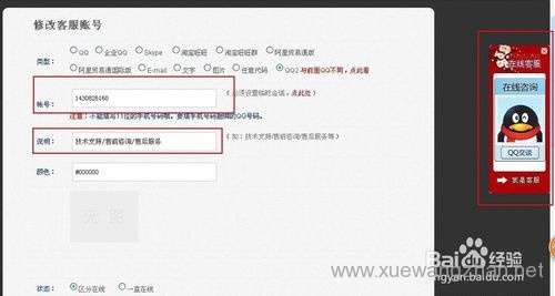 - 4、之后进入设置客服的界面,例如我们刚开始只想添加个QQ客服,需要在客服帐号中添加QQ号,并填写说明,选择客服的样式,那么你的客服状态就会在右侧预览出来,如下图: