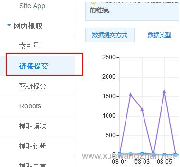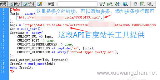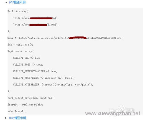 - 进入百度站长平台,注册一个帐号,进入管理后台,在左侧菜单中有一个提交链接,主动推送这里给出的一段PHP代码,如下图: