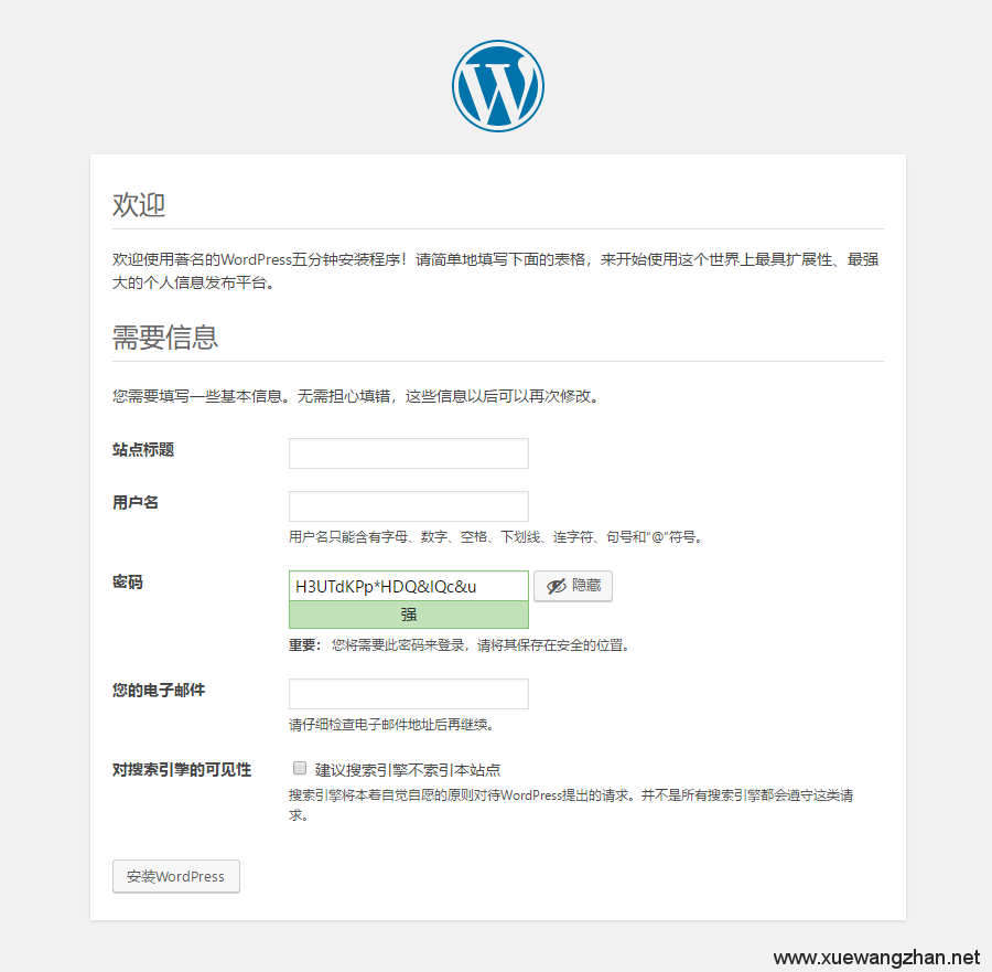 第四步:打开浏览器,输入域名,即可弹出安装界面。填上相关网站信息,点击”安装Wordpress”按钮即可完成。