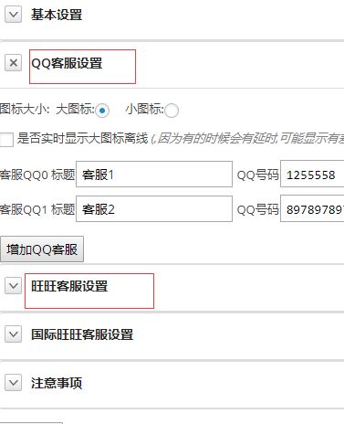 第三步:在后台菜单--设置--QQ客服设置。可以设置QQ号,还可以设置旺旺号,电话号码等。如下图:
