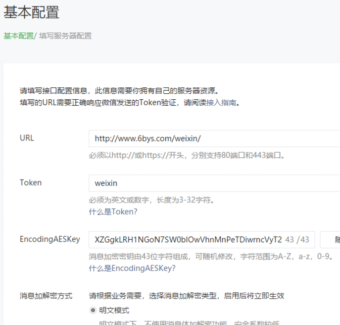 token:weixin,服务器地址:http://你的网址/weixin/,末尾有/。