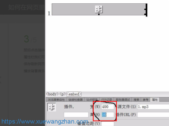 - 鼠标点击插件可以看到下面的属性栏,根据属性栏我们可以任意调整音乐播放器背景宽度大小。保存刷新网页可以看到网页里已经可以自动播放背景音乐了;