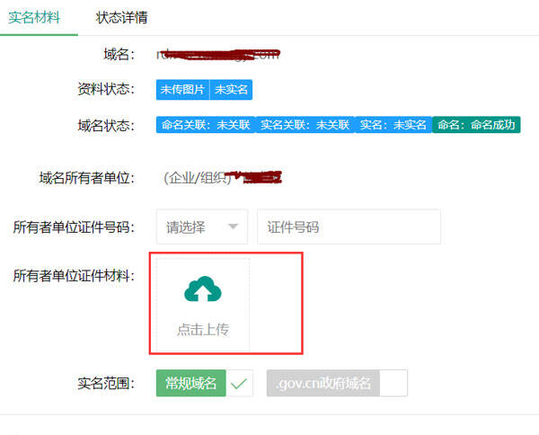 - 点击“域名管理”里的域名实名认证,提交资料;