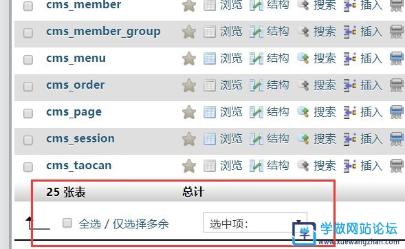 这种最简单,只需要进入网站数据库管理后台,点击所有数据表下面的“全选”,然后选择“删除”,这样就可以将数据库里所有数据表全站删除。