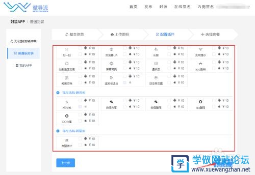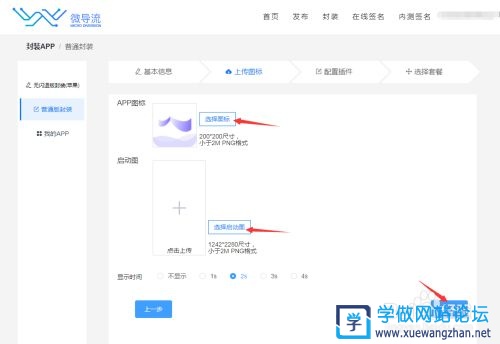 - 选择app图标和启动图,如果自己有就直接点击加号上传,如果没有可以点击“选择图标”选一个平台现成的免费图片。点击“下一步”