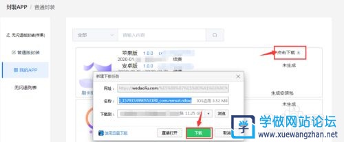 - 稍等十几秒,就能叨叨下载按钮,点击“点击下载”,出现下载弹框,点击“下载”,即可成功下载安装包。