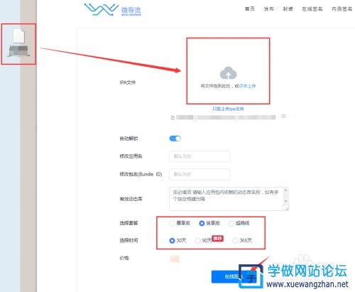 - 进入在线签名页面,可以看到上传IPA文件的位置,将刚刚下载的封装APP,即IPA文件拖入红框区域。下面根据自己的需求选择合适的套餐和时间,然后点击“在线签名”