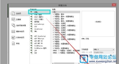3、单击文件-》新建,页面类型选择html,点击创建即可创建一个空白页面出来了。
